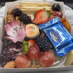 The Picnic Box is a 6″x6″ box and includes three cheese selections, salami, honey or fruit spread fruit, crackers, cookie, chocolate and nuts.